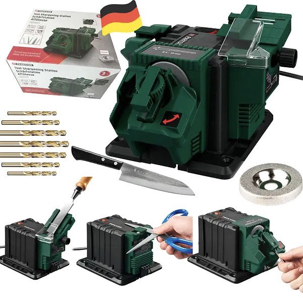 Висока якість заточування: завдяки високоякісному алмазному шліфувальному колу та плавному регулюванню кута заточування від 15 до 50 градусів, цей пристрій забезпечує високу якість заточування різних типів різальних інструментів, як-от ножі, ножиці, леза, стамески тощо.